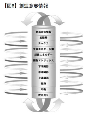 【図6】(右上)は創造意志情報という、宇宙創造から、時空間エネルギー、言霊(ことだま)、水、生命、アジア伝統的な身体エネルギー体系、生理学的な細胞体系、その他の統合の展開原理イメージである。いわば究極の時空展開相を辿る、21世紀版の「神話像」の素描である。私はこれを密かに「新・国生みの模式」と名づけたい。こうした表現に、文明画期推進の意志を読み込んでいただければと思う。