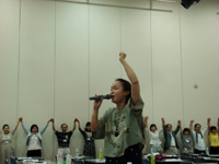 また、シンガーソングライターのさのまきこ氏には、「星はよみがえる」と幸島ソング「百人目の愛」の2曲を歌っていただきました。2曲とも平和への祈りをこめた、心に染み渡る曲でしたが、特に「百人目の愛」では、参加者全員が輪になって手を繋ぎ、一緒に合唱する姿はとても感動的でした。皆の心が一つになって平和への思いが何処かに届けられた気がします。