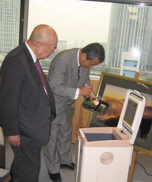 こうやって、手に棒のようなものを持って、波動を測定します。 「“ストレス”の数値が下がってるなー、最近忙しかったからなー」と、船井会長。 |