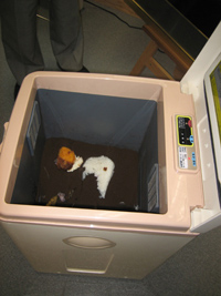 鼎談中、家庭用生ごみ処理機「環境生活館」の実演が行われました。 まず、コンビニの幕の内弁当を生ごみ処理機の中に入れ、しばらくおきました。 |