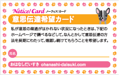 脳幹出血で倒れた宮ぷーが、意思伝達装置のレッツ・チャットを使って気持ちを伝えられるようになりました。講演会で宮ぷーのお話をさせていただいたり、メルマガを書かせていただいているうちに、意思伝達の方法がほとんど広まっていないために、気持ちを伝えられない方がとても多くおられることがわかってきました。もっと気持ちを伝えあうために、GO!GO!意思伝達大作戦を展開します。この本には、「ノーティス!カード」がついています。手にとっていただけたらうれしいです。ノーティス!カードについては次回お話させてください。