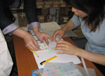 私も「ペーパーアイテム」体験教室に参加させていただきました。講師の方がとても分かりやすく教えてくださり、楽しく夢中で作ってしまいました。手作りウェディングで大切なことは、アイテム一つひとつから全体にわたって統一感を持たせることだそうです。アイテムづくりからどんどんイメージが膨らみ、手作りウェディングも素敵だな〜と夢が広がりました。 |
